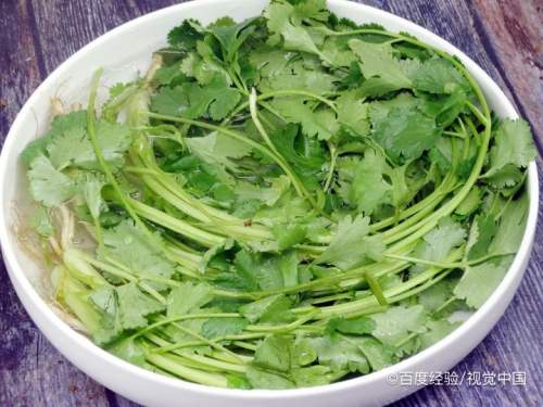 把香菜洗干净,去掉菜头,切段