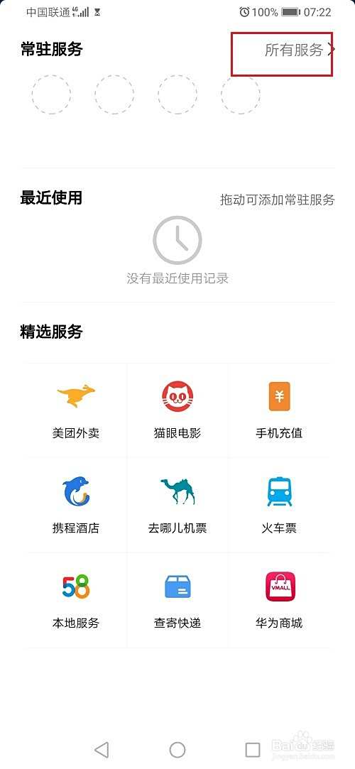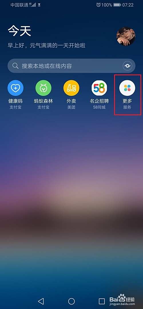 第二步下面来使用一下华为手机的服务直达,打开负一屏,点击更多服务,如下图所示: