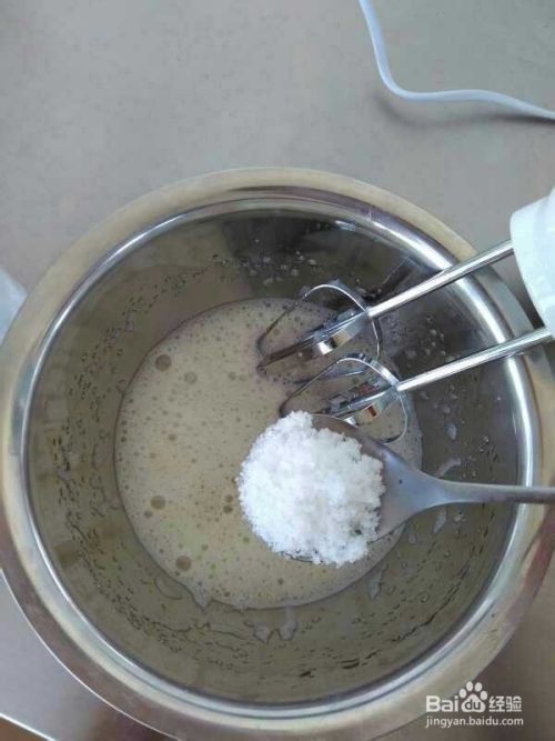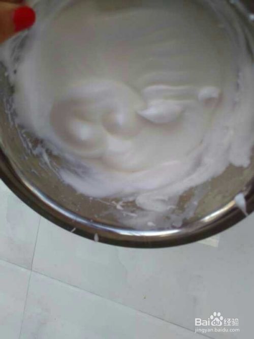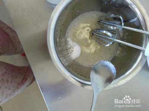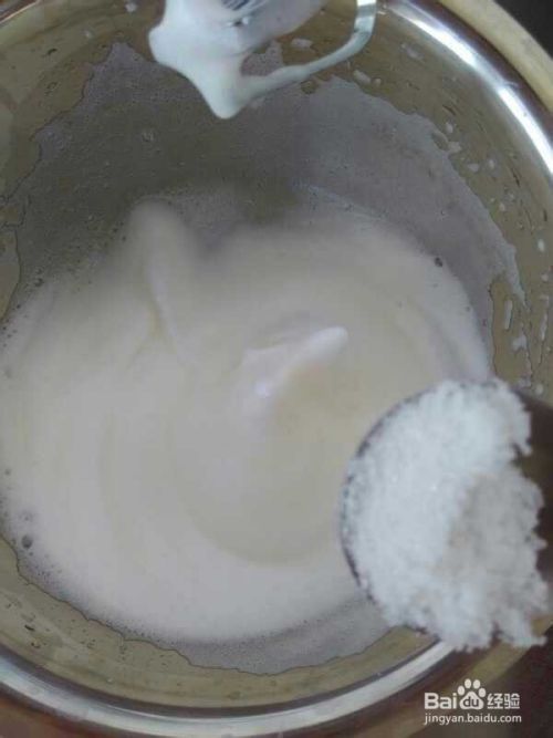 第七步:当大泡泡变成小泡泡的时候,加入第二勺糖,接着打。蛋清上面有小白尖,下面很稀的时候,加入第三勺糖,继续打。打到蛋清不会往下流就可以了。