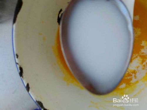 第三步:加一勺糖,放入蛋黄中,进行搅拌。均匀后加入牛奶,加六勺(这是一个人的量)。