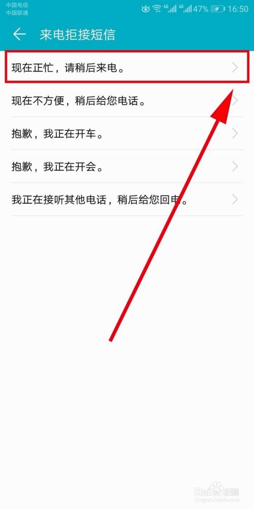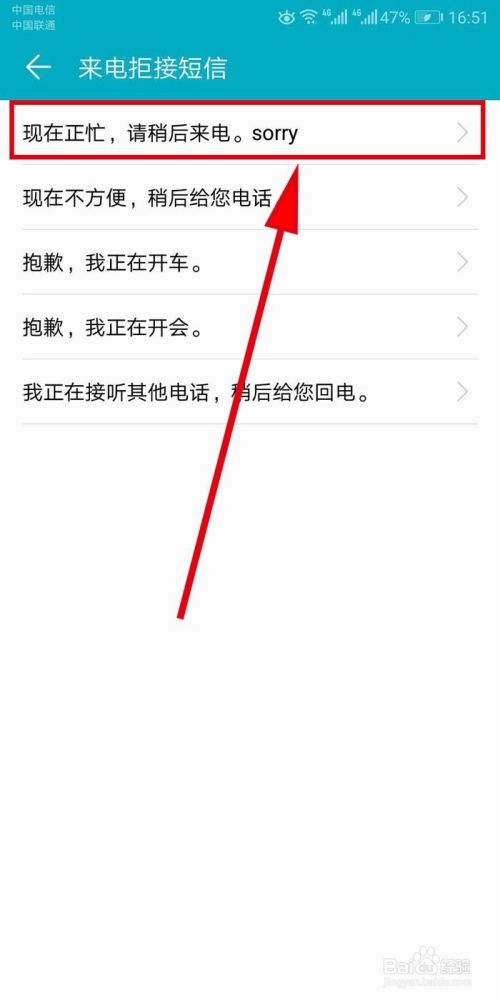 在打开的【来电拒接短信】界面里,系统会列出默认的来电拒接短信的内容,我们选择其中一条,进行编辑