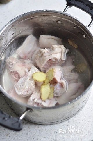 把斩好的猪蹄块放入煮锅,倒入没过猪蹄块的清水,大火煮开后捞出。