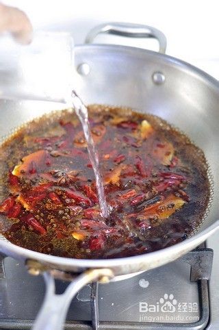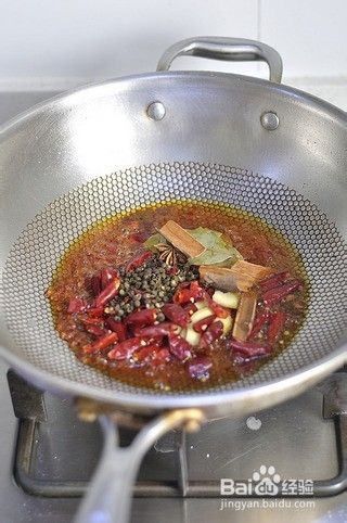 放入麻椒、红椒、桂皮、八角,香叶小火炒出香味。