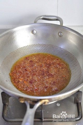 炒锅里倒入油,挖入两汤匙豆瓣酱,小火炒出红油。
