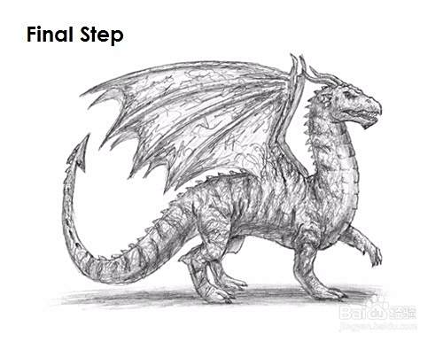 最后一步(可选):在龙图中添加尽可能多的细节。你可以沿着龙的背部绘制尖刺,身体鳞片,翅膀的静脉或任何你想要的东西。