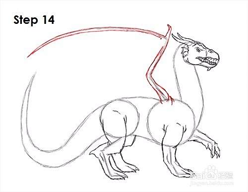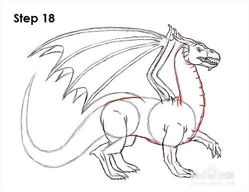 第18步:使用最初的形状和线条作为指南,绘制龙的脖子和身体。使用龙的脖子右侧的小线代表刻度。
