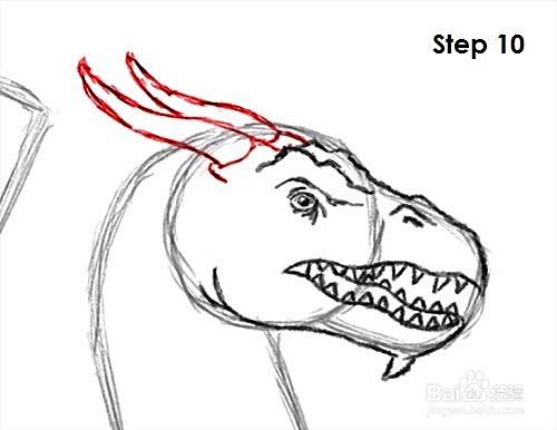 第10步:在龙的头顶部绘制一系列弯曲的线作角。首先轻轻画画,使结构正确,然后使其变暗。让它们更长或更短,或者如果你愿意的话可以画更多的角。