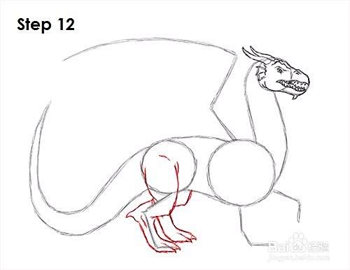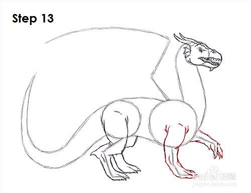 第12步:使用线条作为指南,绘制龙的后腿。首先轻轻画画,以使结构正确。当你对自己拥有的东西感到满意时,继续前进并使其变暗。在底部绘制几个脚趾,在顶部绘制几行以指示皮肤褶皱。在另一侧绘制龙腿可见部分。