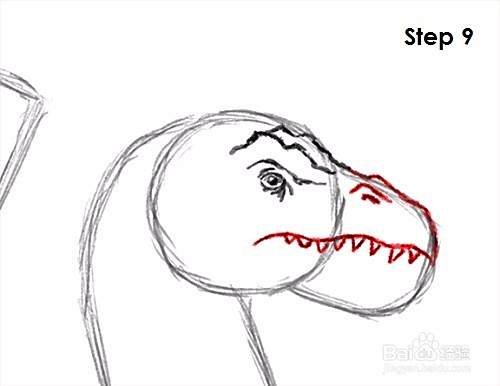 第9步:使用右侧的曲线作为绘制龙的枪口的指南。将嘴的上部绘制成一条向着圆形延伸的波浪线,并在鼻尖上绘制一个小狭缝。使用下面的另一条波浪线绘制龙的下部。在嘴里画出小三角形,形成一排锋利的牙齿。使用弧的底部作为指导绘制下颚。你可以在龙的下巴上画一个小小的钉子来获得更多的细节。