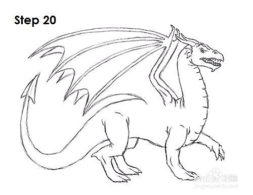 第13步:使用最初的线条作为指南来绘制龙的前腿。记得一开始就轻描淡写,只有当你得到正确的结构时才会变暗。你可以在另一侧画出龙的腿,或者为更简单的版本,像后腿一样将它拉到另一条腿旁边。如果您将腿抬起,请将龙的脚趾画成一系列朝下的斜线。