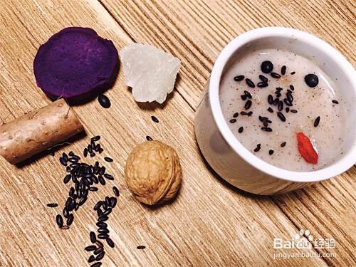 取适量的黑芝麻、黑豆、黑米、豌豆、荷包豆、紫薯、山药、芡实、核桃、枸杞、桑葚、冰糖,全部捣碎,研磨成粉,混合均匀