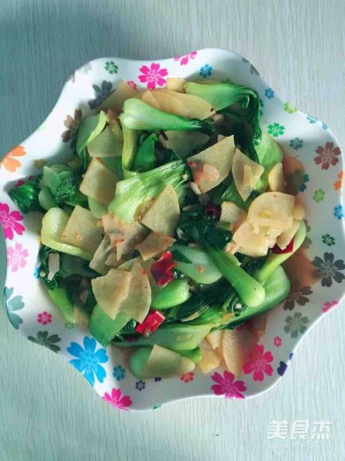等土豆炒两三分钟,放入洗好的油菜,翻炒两三分钟,然后放盐,放一点醋,翻炒至熟透。