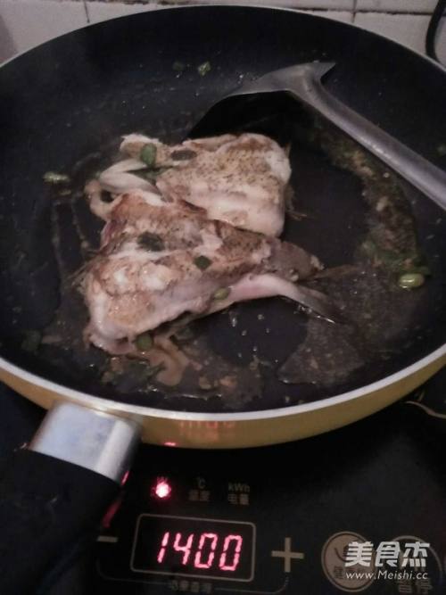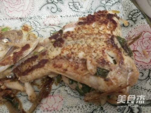 葱花放到拍扁的鱼上,对折