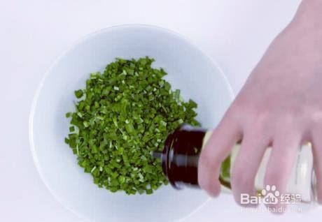 韭菜准备出少许,将其摘洗干净后,控干其中的水分,将韭菜切成小碎丁,放入在一个大碗中,淋入2勺食用油,用筷子将其充分搅拌均匀。