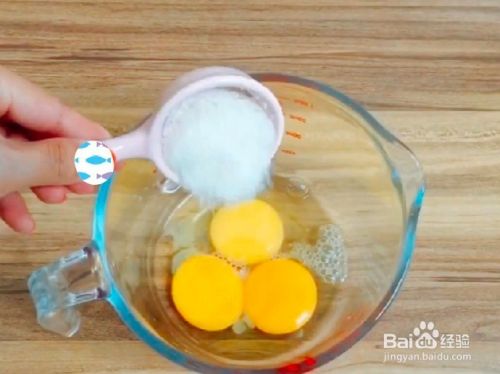 两个蛋黄加上一个蛋全,加一点柠檬汁去腥,再加一点白砂糖。