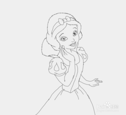 最后在身体的后面画出白雪公主的右侧的胳膊及手部,这样白雪公主就画好了,如图所示: