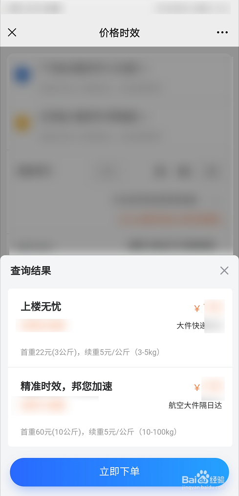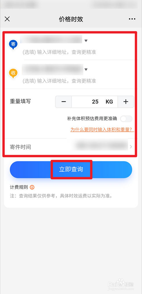 如下截图,完善寄件地址、收件地址、寄件时间,然后选择“立即查询”。
