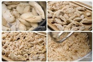 鸡胸肉先汆水,撇去浮末。再加入葱姜料酒,放入高压锅,上汽后煮约1520分钟。至轻轻一压就熟烂。把肉滤掉水分,随意的压碎,再放入厨师机,23档,用k浆,打约十几二十秒。至成为小肉丝~用手捏捏没有大的粗肉丝即可。(我使用的是海氏M6厨师机,不同的厨师机档位时间仅供参考,另外如果是功率较小的厨师机,建议配方减少做否则电机恐怕承受不住)