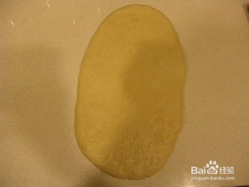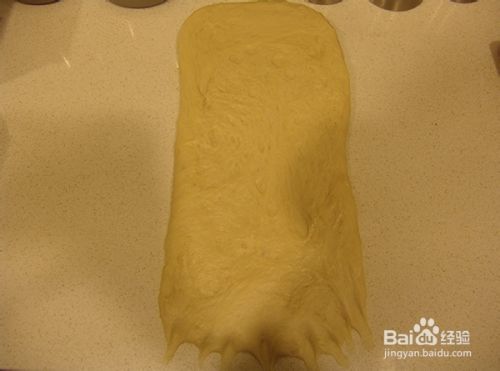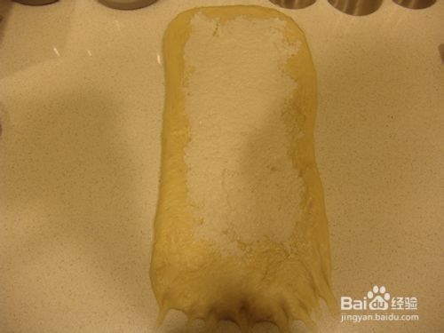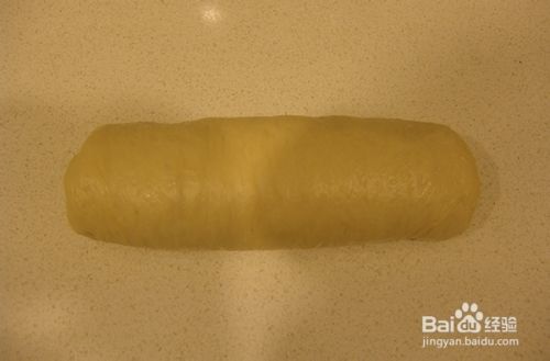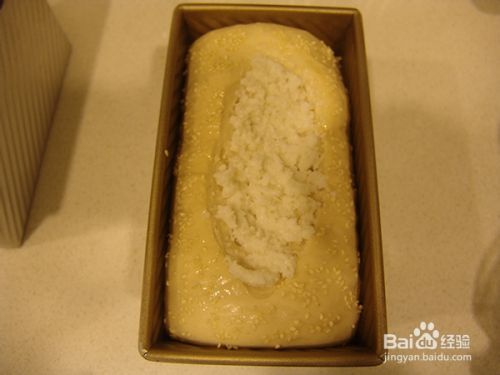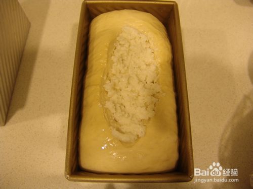 将面团擀成长面片,翻转后抹上椰蓉馅,卷起来,放入吐司模。