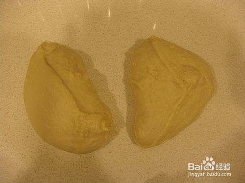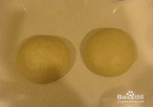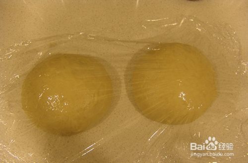 面团揉好以后,称重分割成大小均匀的两份,分别滚圆,盖上保鲜膜,醒15分钟。