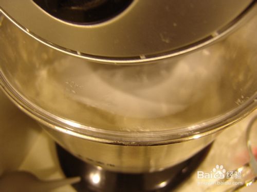 将椰奶和素蛋液倒入混合好的面粉中(如果素蛋液还没冷却,先将椰奶倒入素蛋液混合,再倒入面粉中),先用低速搅拌2,3分钟再转中速搅拌到面筋出筋至八成。