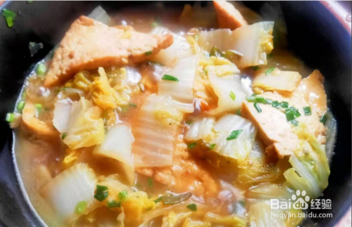 锅里放入适量的水,煮至白菜熟透,再放入提前用菜籽油炸好的豆腐角,继续炖煮。