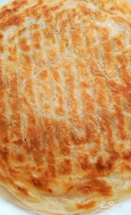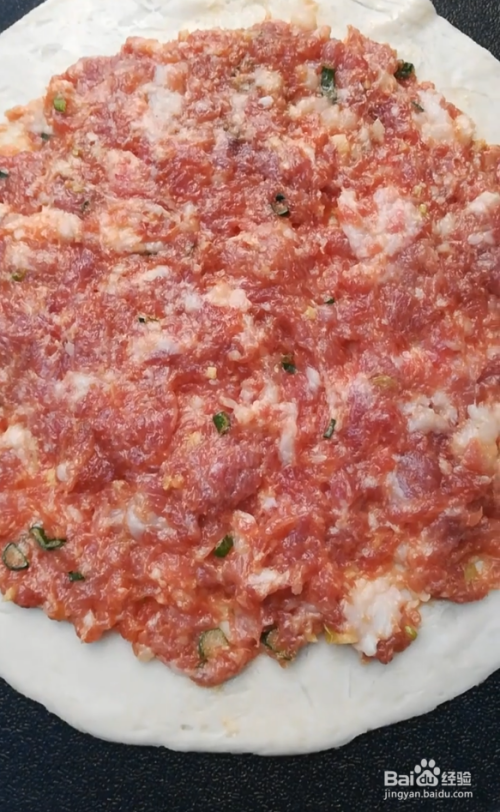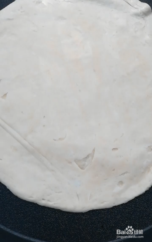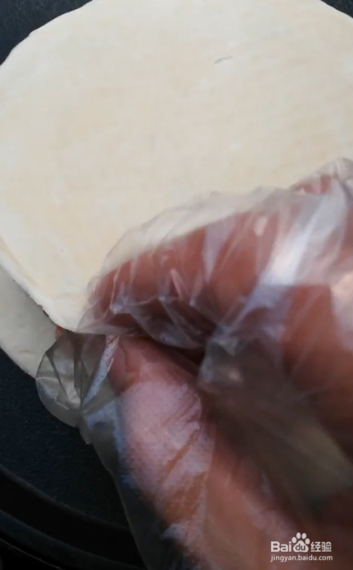 把手抓饼上摊上肉馅,再在肉馅盖上一张手抓饼。边上压实。