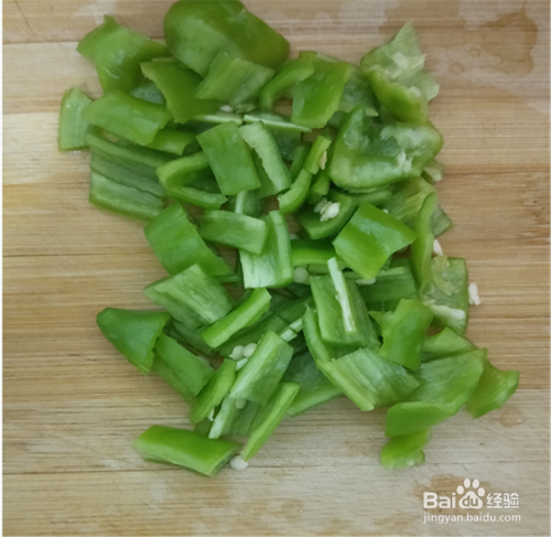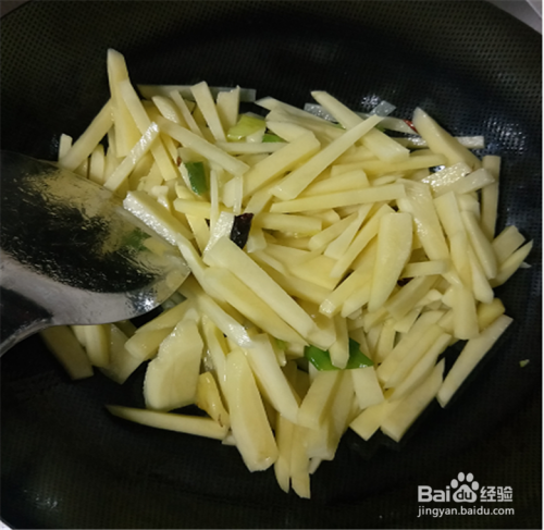 带土豆炒至5成熟时放入适量醋,6成熟时放入青辣椒,继续煸炒。