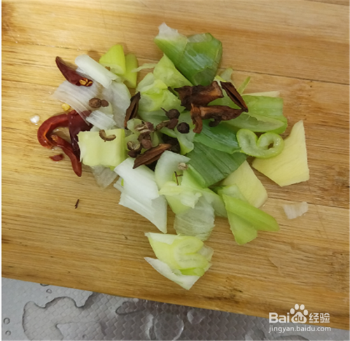 生姜切片,葱花切小块,干辣椒水洗切成两节,准备好花椒八角,这些配料都放在一起就可以。青辣椒切小块。