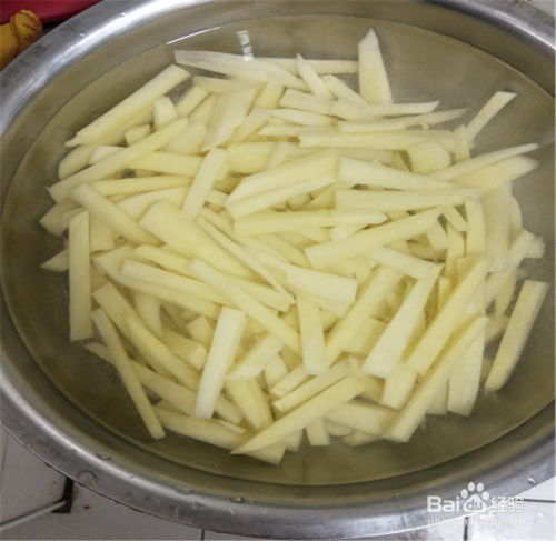 削净土豆切成条,粗细长短可根据个人喜好。切好后浸泡在凉水中。