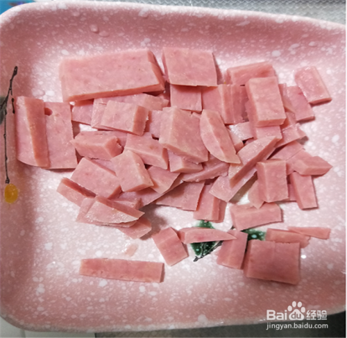 火腿切2-3厘米的小条,放入盘中备用。(不要放太多火腿,土豆和火腿的比例为5:1就好)