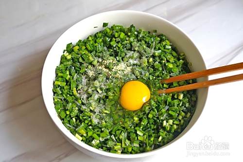 将切碎的韭菜和粉丝、鸡蛋、鸡精、辣椒粉、油、盐一起调拌成馅。
