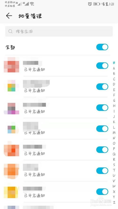 在【批量管理】设置项下,可左右滑动【全部】的开关对全部应用进行设置,也可以单独滑动某个应用的开关进行设置;