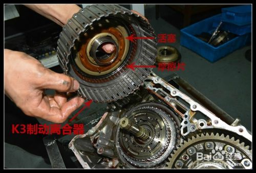 拆下迈腾09G变速箱的K3制动离合器,这给迈腾09G的制动离合器内部有摩擦片和活塞,拆下来检查迈腾09G的变速箱的活塞和摩擦片。