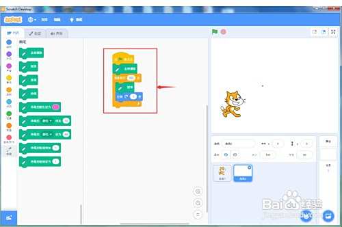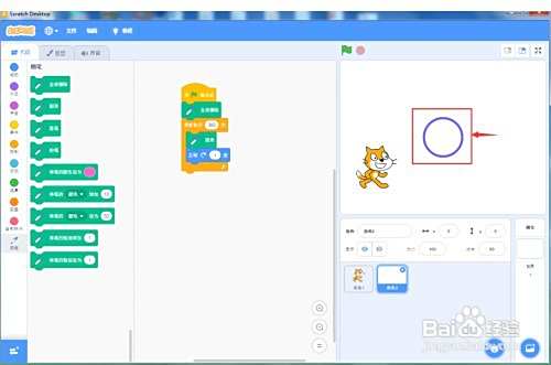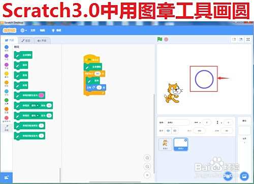 点击代码,给小圆点添加如下脚本,使用图章工具,让它旋转1度,重复执行360次 ;