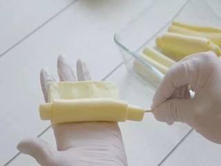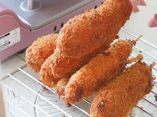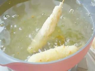 取出芝士条,插上竹签,包上芝士片,放入面糊中,裹上面糊,再裹上面包糠和花生碎,放入热油锅中,大火,炸至金黄色。
