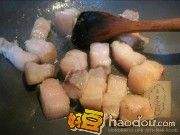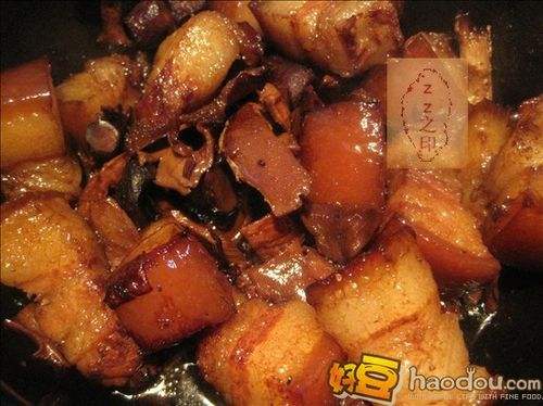 糖炒化后,放入五花肉块,迅速翻炒,尽量让每块肉都裹上糖,放入大片姜片,香菇脚用开水泡开后,并去掉不能吃的部份,红烧肉放入八角翻炒