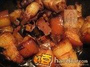 ,转中火,中火烧至水只有原来一半的时候,加入泡过切好的笋干,大火再次烧开,转小火,继续烧,随着水慢慢少,从每三分钟翻一次,到每半分钟翻一次,直到水份消失,红烧肉的油开始出来,以不焦为基础,红烧肉能尽量多出油,这样的标准,做出的红烧肉入口即化,而且还不油腻。