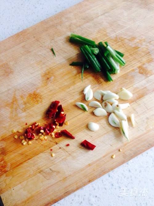 锅里倒入适量的油烧热后,放入大蒜,香葱和干辣椒炒出香味