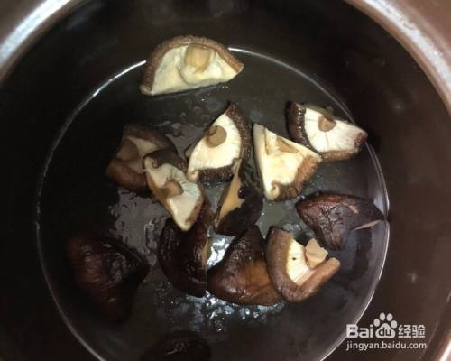 将香菇切成小块,然后 放入砂锅底,具体如下图