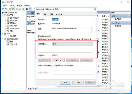第三步进去Superfetch的服务属性界面,可以服务是启动的,如下图所示: