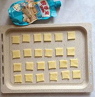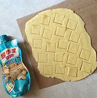 我大约擀成0.4厘米厚的样子,然后用方形模具刻出所需的形状。多下来的面团可以再次整形,再次擀开后依旧用模具刻出形状。