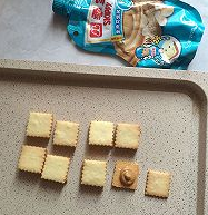 饼干底部烤到微黄时,四边微微上色时立即把饼干取出,不要去移动,刚烤好的饼干是软的。放凉后在一片饼干上挤入四季宝花生酱。不得不说个挤挤装的设计是真的赞,直接挤一下花生酱就出来了,非常的方便。