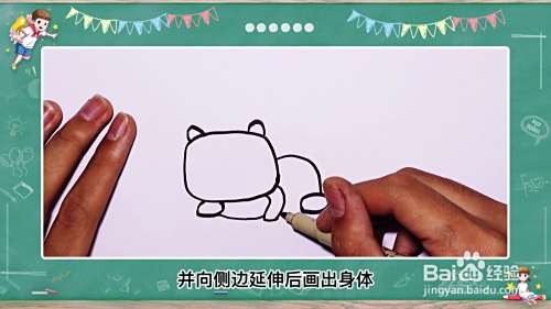 然后在脑袋下方添上手并向侧边延伸后画出身体、脚以及小尾巴,接着画上黑眼睛以及笑脸的嘴巴,