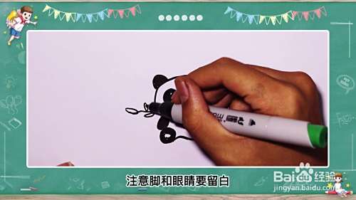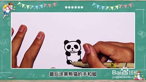 最后将熊猫的耳朵、手、脚、以及眼睛涂黑,注意脚和眼睛要留白,就画成了吃竹子的熊猫。