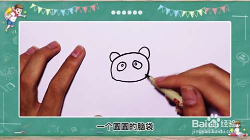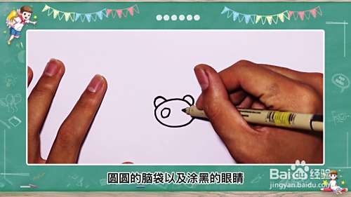 首先画两个耳朵,圆圆的脑袋以及涂黑的眼睛,嘴巴和鼻子画成笑脸的样子。