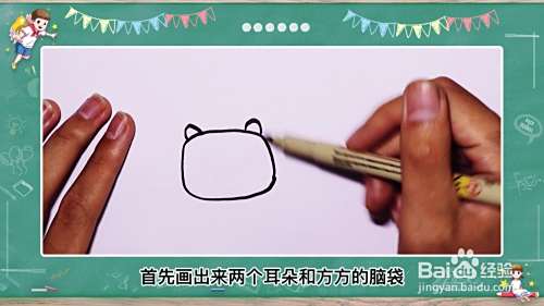首先画两只耳朵、一个圆圆的脑袋,在圆圈里添上眼睛,嘴巴和鼻子。