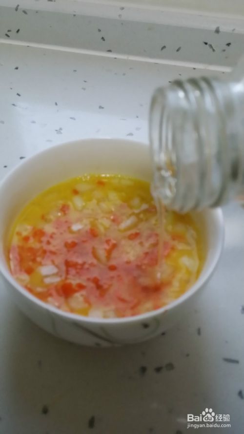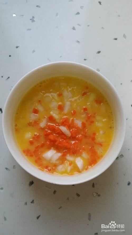 将胡萝卜丁、洋葱丁加入到打好的蛋液中。