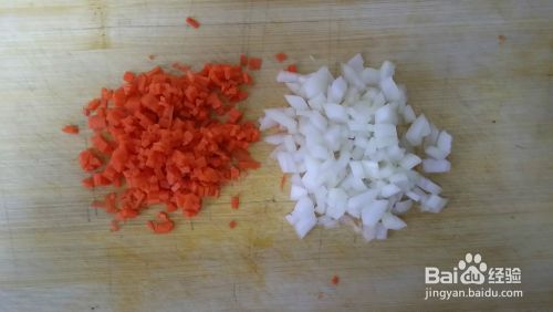 将鸡蛋打入碗中,并搅拌均匀。胡萝卜、洋葱切成小丁备用。
