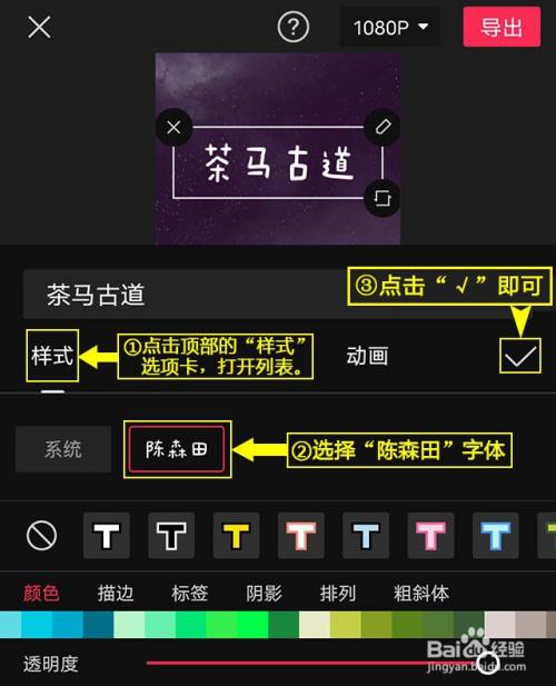 添加字体。点击顶部的“样式”选项卡,打开列表,选择“陈森田”字体,点击右上角的“√”即可。